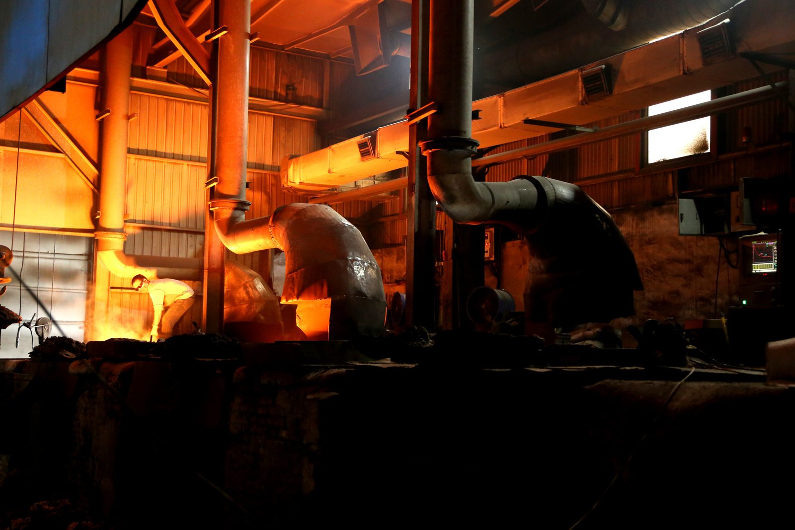 We add pig iron and defective castings from production to the induction furnace. The temperature of this furnace exceeds 2000 degrees Fahrenheit and can hold 10 metric tons of molten iron. It takes 45 minutes to melt 22,000 pounds of metal charge.